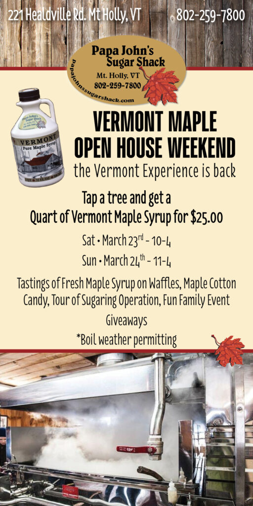 Saturday, March 23 10 a.m. – 4 p.m. and Sunday 11a.m. – 4 p.m. Tap a tree and get a Quart of Vermont Maple Syrup for $25.00.